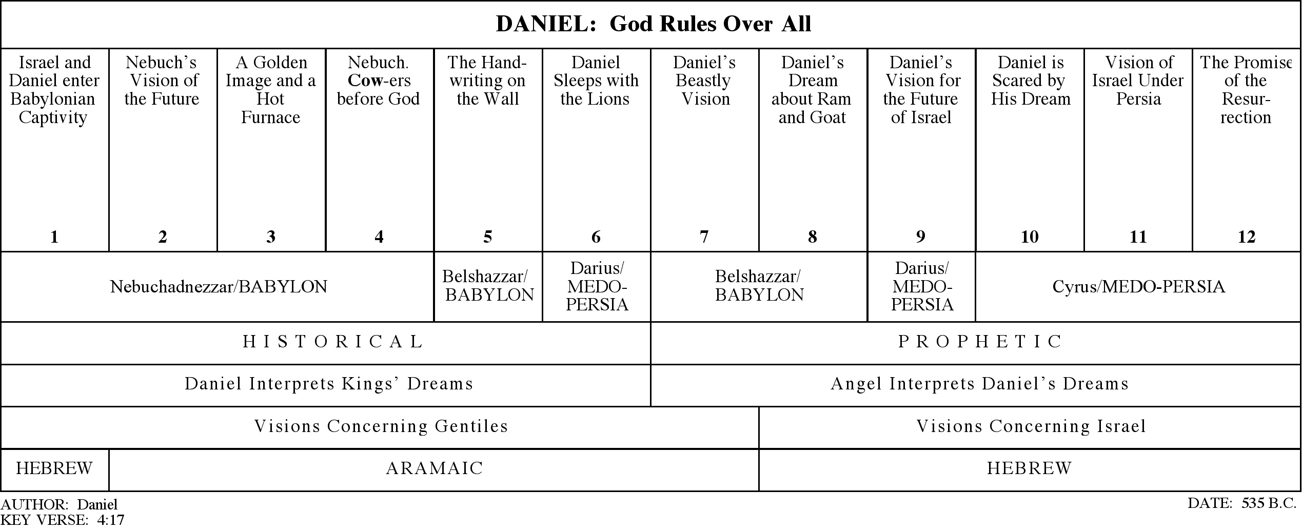 The book of Daniel is one of the more popular Old Testament books — it is filled with historical drama, interesting characters (where else can you read of the king who became like a beast who became a king again!), exciting visions, and fast action.  In short, Daniel is a book of history.  It looks backward at the history of Daniel and the other exiles in the first six chapters of the book, yet it also offers a perspective of what history will look like in the future through the visions in chapter 2 and chapters 7-12.  These visions are essential in understanding the rest of the prophetic writings in the Bible.  Without Daniel, NT prophecy would be very difficult to interpret.  Passages like the Olivet Discourse (Matt. 14, 15; Luke 21), Paul’s doctrine of the man of sin (2 Thess. 2), and the book of Revelation would all be more obscure without this book.