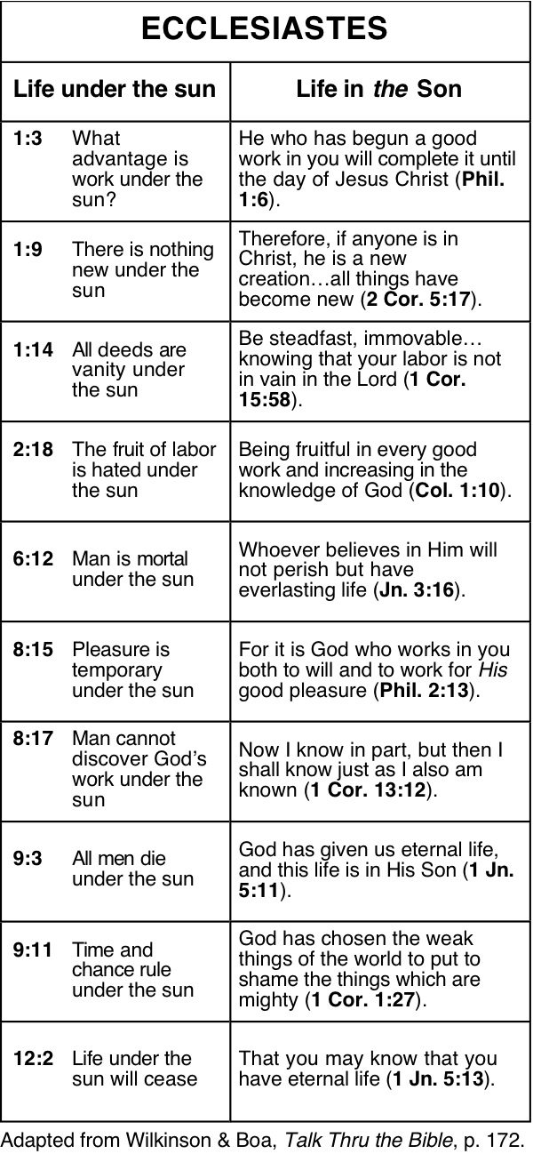 But all those activities found empty by Solomon are infused with meaning and fulfillment as they are redeemed by Christ. The believer in Christ finds them to be satisfying not because they are inherently satisfying, but because he engages in them as an expression of his love for Christ.