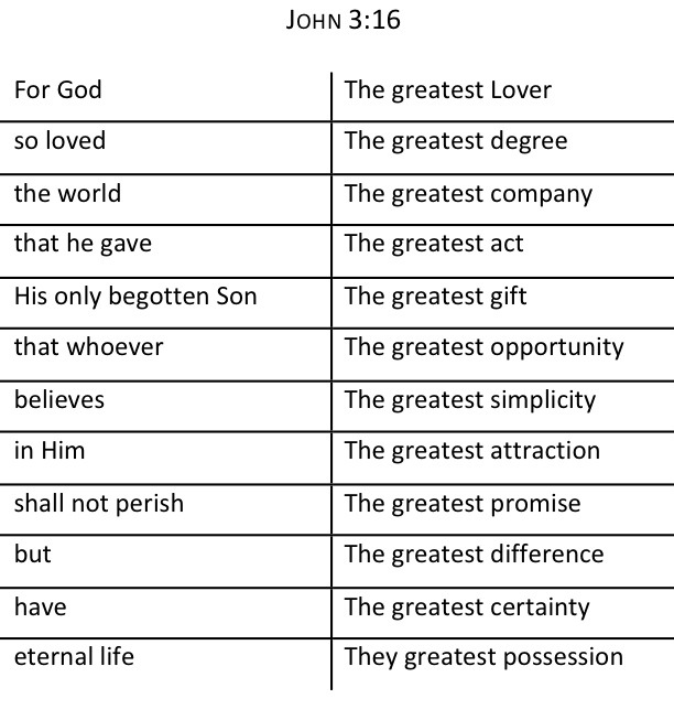 Posted on January 18, 2012 by Terry Enns John 3:16 — From R. Kent Hughes, John: That You May Believe. Share this: Click to share on Facebook (Opens in new window) Facebook Click to share on X (Opens in new window) X Click to email a link to a friend (Opens in new window) Email Click to share on Printer Friendly (Opens in new window) Printer Friendly More Click to share on Reddit (Opens in new window) Reddit Click to share on Pinterest (Opens in new window) Pinterest Click to share on Pocket (Opens in new window) Pocket Like Loading... Related