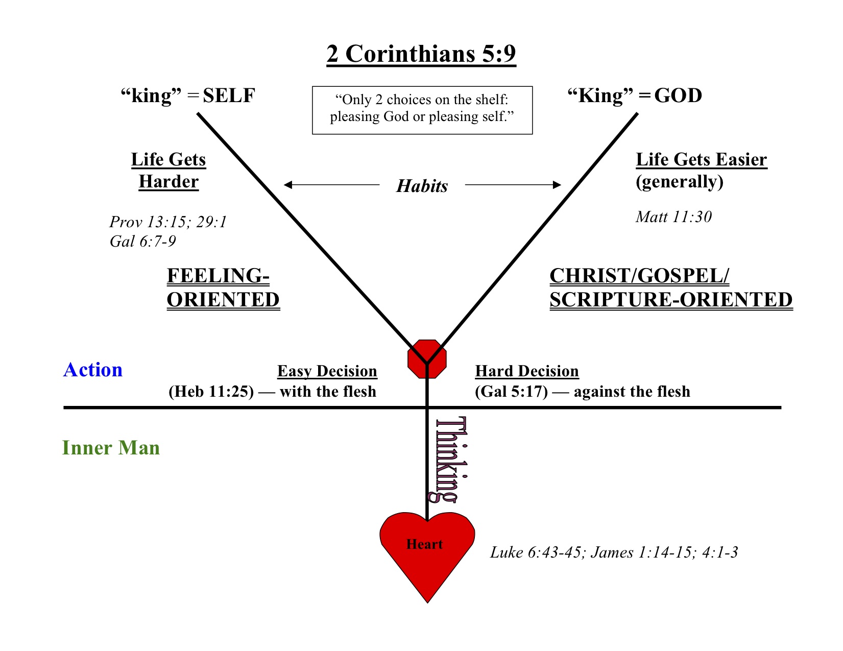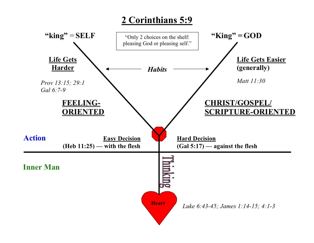 Some time ago, I came across this chart (commonly called, “the Y-Chart”), which I have modified very slightly to help us understand how each decision we make flows out of the desires and longings of our hearts.  Many have found this helpful in making daily decisions that please the Lord.