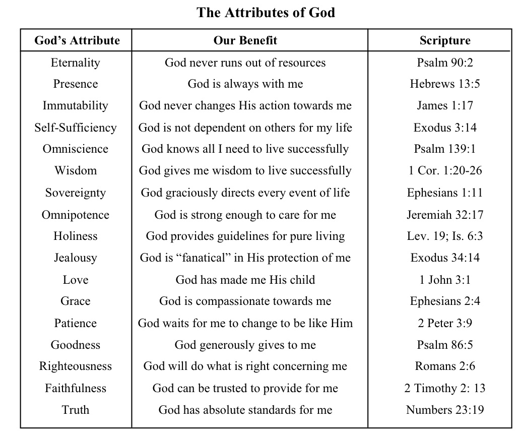 Secondly, we can only comprehend the character of God as we contemplate His attributes as they are revealed in Scripture. These attributes can be divided into two broad categories — communicable and incommunicable attributes — demonstrating both His transcendence and approachability. Here is a compilation of some of the most basic of His attributes: