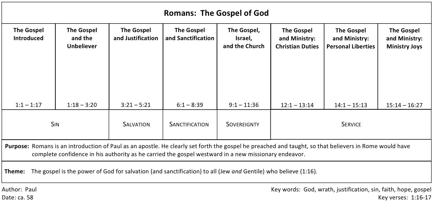 Sunday morning I began a sermon series on the book of Romans. My goal in starting a new sermon series is to provide a summary and overview of the contents and flow of the book. And sometimes that is best seen in a chart. Here is my current attempt at charting Romans (I reserve to change this by the time I finish this some months years in the future).