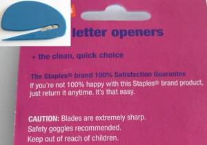 - On a Staple’s letter opener: “Safety goggles recommended.”