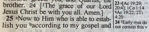 That has happened with verse 24.  As we read the final chapters, it seems like Paul has tried to “stop” several times (15:33; 16:20, 24, 25-27).  But did Paul write all the different endings?  As we have looked at the evidence, it seems quite clear that v. 24 was not written by Paul but inserted by someone who thought the book should end there, because the oldest manuscripts don’t have this verse.